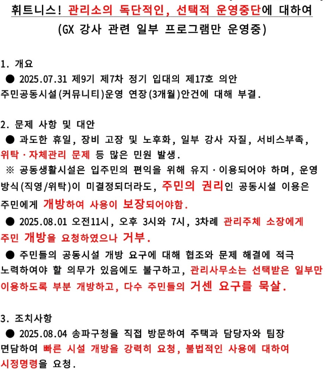 1. 아파트 앱 도입을 추진함2. 입대의에서는 아파트너와 직방을 후보로 두고 있었음3. 아파트 앱 도입은 찬성하나 아파트너와 직방을 비교해서 파크리오에 더 나은 앱을 도입하자라는 주민들의 의견4. 주민들은 직방이 좀더 좋다는 의견5. 입대의에서 업체를 불러 프리젠테이션 요청6. 입대의에서 직방의 태도 및 옷가짐이 안좋다고 점수를 낮게줌7. 입대의에서 아파트너 앱으로 결정(주민들 의견 묻지 않음)8. 주민들 반발하지만 입대의에서 그냥 결정9. 아파트너 앱 도입직후는 모든 게시판 및 기능이 열려있었음10. 주민들이 아파트너 게시판을 많이 사용하자 대부분 기능 및 게시판이 막힘11. 아파트너에 문의하니 관리소에서 막아달라고 요청했다고 함(관리소에서 요청하면 게시판 풀어준다고 함)12. 관리소에 문의하니 입대의..